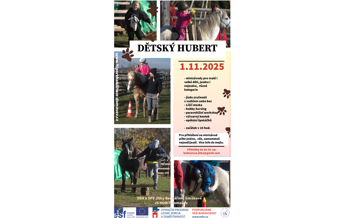 24. - 26. 10. 20251x – 2× denně individuální hiporehabilitace dle domluvy a potřeb klienta Vhodné pro všechny věkové kategorie s různými postiženími a speciálními potřebami, ne těžké postižení, váhové omezení do 80 kg, individuální hiporehabilitační plán a intenzivní působení na zlepšení psychomotorického vývoje. Dobrá dostupnost i hromadnou dopravou z Brna, Rosic… Možnost ubytování v blízkém Penzionu U Němců Info a přihlášky na: bednarova.jitka@gmail.com